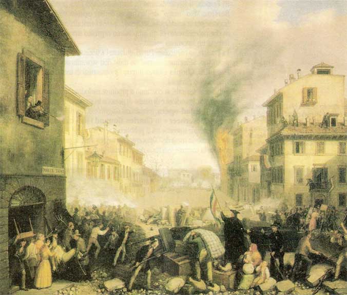 In all quarters of the city barricades sprang up like mushrooms. Everything went, freely given, to their construction; the benches of the Scala, the beds of the young seminarists, the court carriages, found hidden in a disused church, building materials of the half-finished Palazzo d'Adda, grand pianofortes, valuable pieces of artistic furniture, and the old kitchen table of the artisan. Before the end of the fight the barricades numbered 1523.